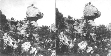 Deux sculptures en chocolat massif représentant la stéréoscopie "Tête du Père Ubu", un ensemble de rochers à Montpellier-le-Vieux, Les Gorges du Tarn (cp. Organographe 6, p. 78). Cette pièce chocolatée, localement saupoudrée de sucre glace, est en contre-relief, une invention créée pour l'occasion par l'artiste. Par l'interposition d'une visionneuse type Wendel-Holmes, les deux hauts-reliefs se superposent en une seule image : le relief d'une des deux sculptures se confond dans le contre-relief de la seconde, donnant ainsi l'impression de deux dimensions, là où il y en avait en réalité trois.